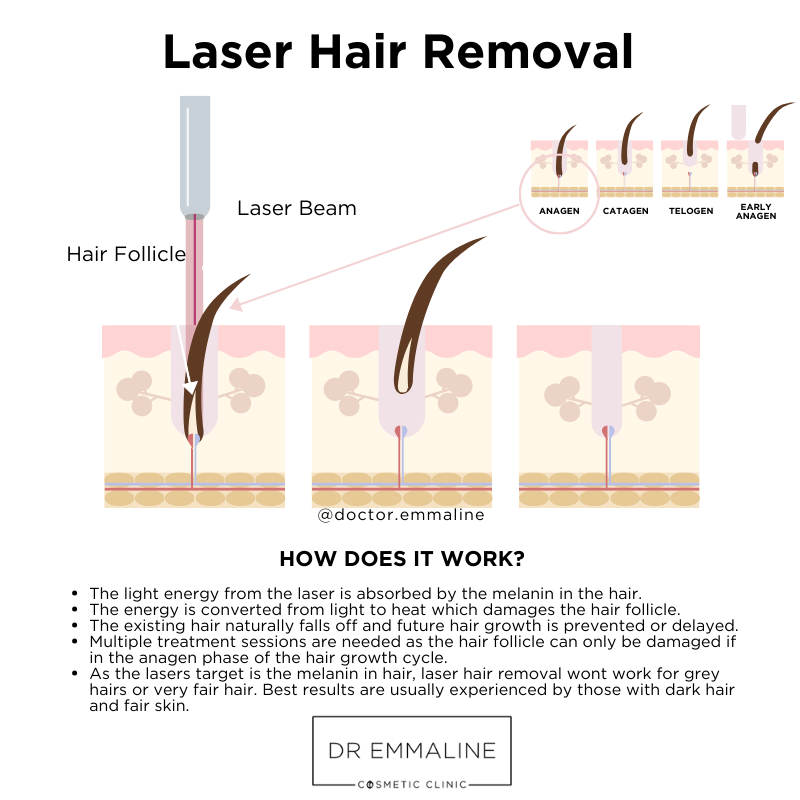 Unwanted hair in areas is certainly a cosmetic issue, and many aesthetic clinics offer hair removal as part of their treatment menu. Hair removal of thicker, visible hair can be done via laser hair removal, or with intense pulsed light. Laser works by heating up the pigments in the hair, and damaging the hair cells, causing them to die. The hair will fall out and will not grow back, provided they were in their active growing stage (anagen phase) when blasted with the light. This is why complete hair removal will take a few sessions, as your hair is in different growth phases at different times, and any hairs not in the anagen phase will not fall out.